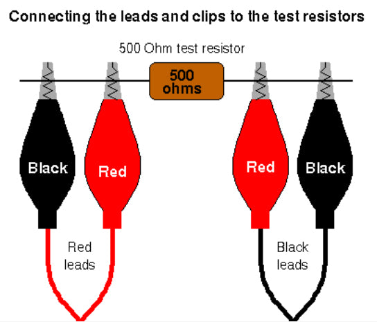 - Attach the 500 ohm resistor (located in the test tube) to the subject cables. Note that the two red clips should be adjacent to the plastic middle of the resistor and that the clips of the red cable should be on one side, the black on the other (see diagram above).